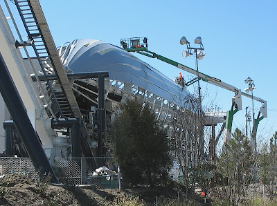 A fabric covering is being added to the zeppelin frame of the Led Zeppelin, the signature roller coaster at the new Hard Rock Theme Park.
